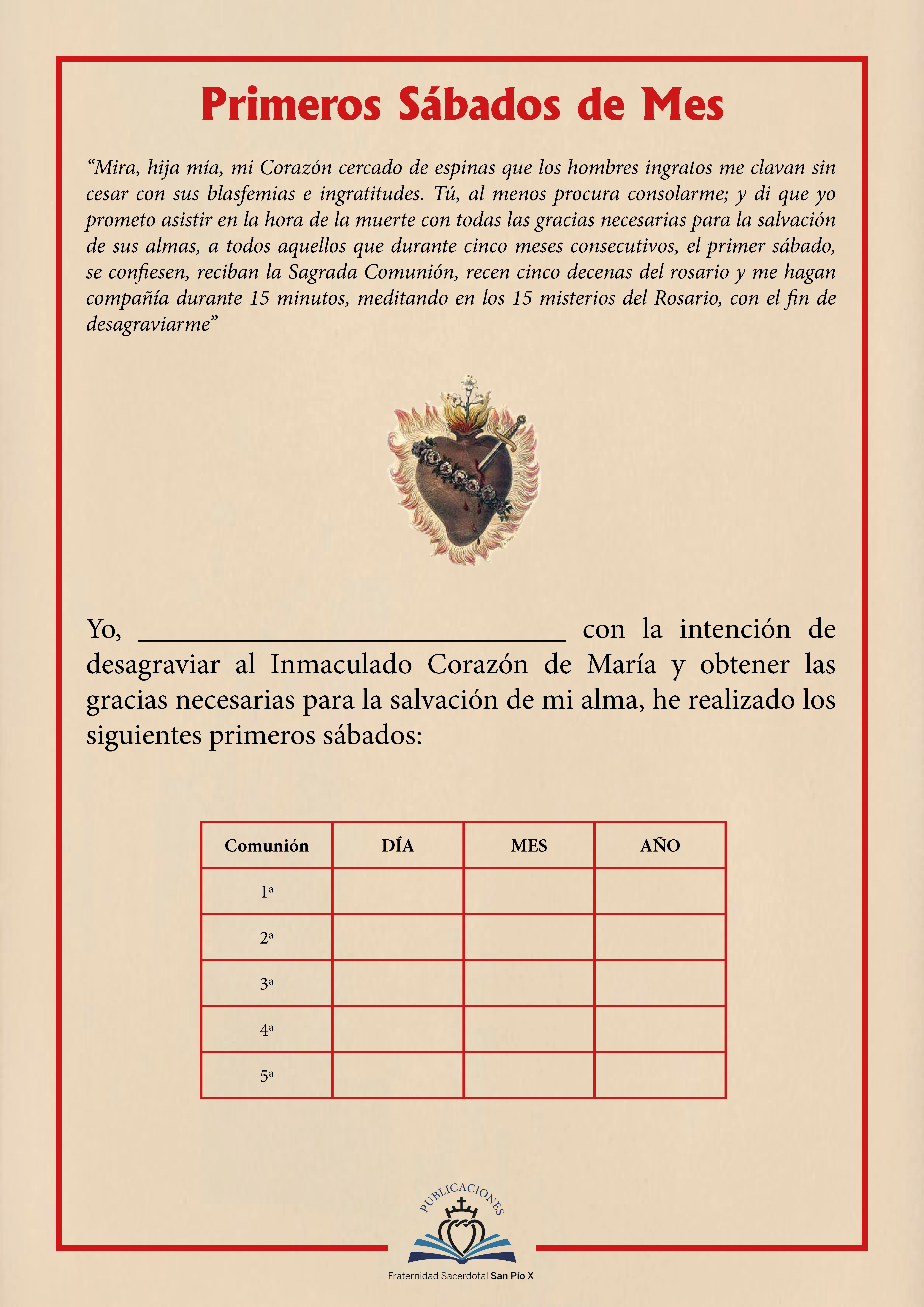 Mira, hija mía, mi Corazón cercado de espinas que los hombres ingratos me clavan sin cesar con sus blasfemias e ingratitudes. Tú, al menos procura consolarme; y di que yo prometo asistir en la hora de la muerte con todas las gracias necesarias para la salvación de sus almas, a todos aquellos que durante cinco meses consecutivos, el primer sábado, se confiesen, reciban la Sagrada Comunión, recen cinco decenas del rosario y me hagan compañía durante 15 minutos, meditando en los 15 misterios del Rosario, con el fin de desagraviarme».