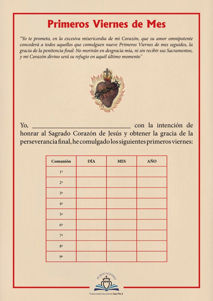 «Yo te prometo, en la excesiva misericordia de mi Corazón, que su amor omnipotente concederá a todos aquellos que comulguen nueve Primeros Viernes de mes seguidos, la gracia de la penitencia final: No morirán en desgracia mía, ni sin recibir sus Sacramentos, y mi Corazón divino será su refugio en aquél último momento».